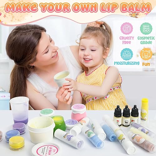 COMPLETE DIY LIP BALM KIT: JCOOS kids craft kit includes 3 shea butter, sweet almond oil, beeswax for lip balm making (35g), 4 flavored oils, 4 mica powder, 13 lip balm tubes, 1 lip balm stickers for tubes, 2 measuring cups, 2 gloves, 2 spoons, 2 sticks, 6 droppers, 1 instruction manual. Everything your kids needs to make your own lip balm