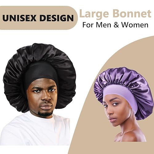 Large and Roomy Satin Hair Bonnet for Sleeping,Fit Most Hairstyles:Our big bonnet's OD is about 13.8".It is roomy enough to hold short braids,thick hair,long hair,dreadslocks,curly hair,dreads,crochet hair,wigs,locs,etc.Our sleep bonnet is made in double layers, 2 colors in 1 pack and you can share this hair bonnet with your bosom friend,families