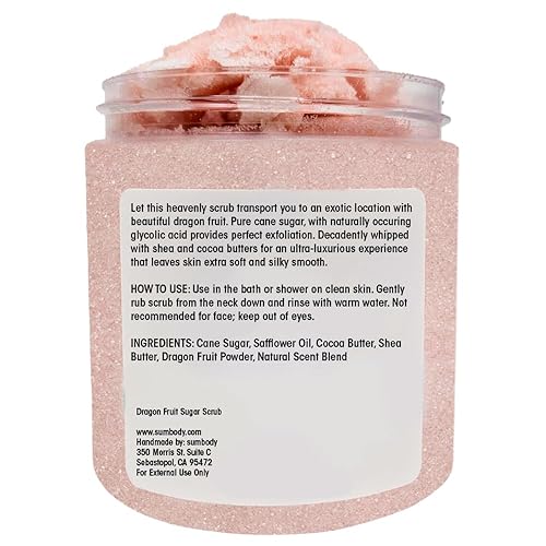 Gently Exfoliates, Smoother Skin: Our Dragon Fruit Sugar Scrub is a body scrub designed to exfoliate and remove dead skin cells. This body scrubber exfoliator features organic pure cane sugar, naturally rich in glycolic acid, to reveal a polished, visibly smooth complexion. Ideal as a body exfoliating scrub, it targets rough bumpy skin, bumps, ingrown hairs, detoxes, & leaves your skin feeling soft, renewed, & radiant, making it a standout in body care products. Safe for sensitive skin. Available in 3 scents - Vanilla, Citrus, & a fruity Dragon Fruit, replacing the need for a daily perfume.
