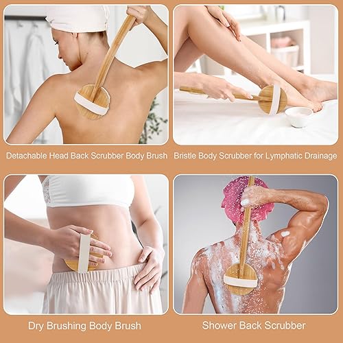 Detachable Head Back Scrubber Body Brush: The long handle bath body brush enhances the friction with the skin and removes the dirt and dead skin from the skin effectively. The bristles are made of boar bristle, it is durable, safe and harmless materials, it easier to clean hard-to-reach back skin or leg. The brush head can be detached, it can be used for two purposes!!! Making it ideal as dry brush.