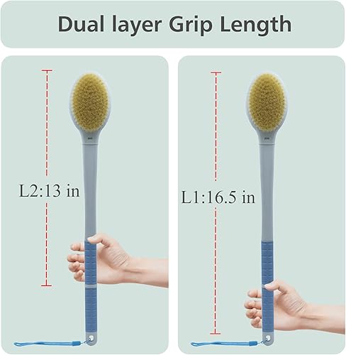 LONG HANDLE BACK BRUSH - This Extended Long Brush 20.5 inch Long from Tip to Tip,to Reach any Part of your Back Easily.The Handle is Covered in Silicone for a Firm Non-slip Grip.There is also a Little Shorter Long 17.5 inch Brush in the Listing,Please Choose which one Better for you.