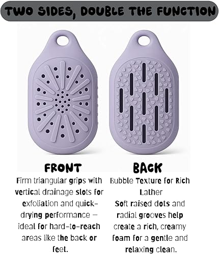 Gentle Yet Effective Exfoliation Enjoy a spa-like cleanse with this dual-sided silicone bar soap scrubber. Use the soft, round-textured front for sensitive skin, and the firmer back side for exfoliating heels, elbows, or back.