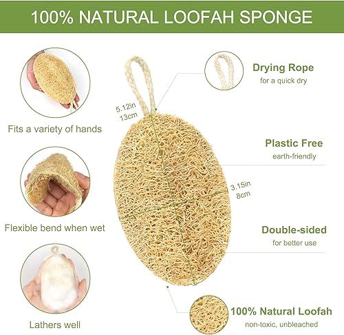 NATURAL LOOFAHS--Our organic loofah dish sponge is made from pure natural and biodegradable loofah, which is safe and environmentally friendly. From picking, shelling, drying and packing are free of any chemicals and harsh processes that could harm them. Loofah sponges Size: 5.12in*3.15in. Note: As a pure natural product, there may be slight variations in color from each product to another.