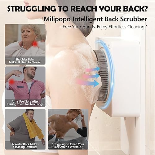 LONG-LASTING POWER WITH SMART CLEANSING MODES: Powered by a built-in 5000mAh rechargeable battery, the Milipopo electric back brush supports up to 45 days of use on a single charge (based on 5 minutes per day). Featuring 360° brush rotation and AI pressure-sensing technology, it automatically adjusts speed based on your body contact—gently slowing for sensitive areas and increasing power for a deeper clean. Whether for everyday comfort or intensive cleansing, Milipopo adapts to your skin’s needs.