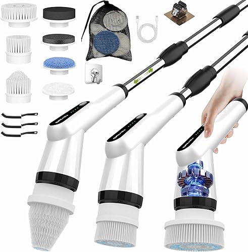 What You Get: 1*Electric shower scrubber, 7*interchangeable brush heads, 1*Extension Handle+1*Main Hanlde, 1*USB-C charging cable, 1*user manual, 3*cleaning brushes, 1*storage bag, 2*hooks. This scrubber also makes a thoughtful gift for family, parents,or friends.