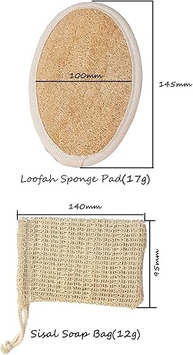 【Complete Bathing Set】This 4-in-1 loofah set includes: Two body exfoliating loofah sponge (hand-sized) for gentle scrubbing, A long loofah back scrubber for shower to easily reach every corner, A durable sisal soap bag for rich lather and zero soap waste