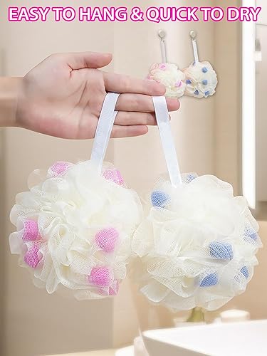 【Convenient Rope Handle】Our body scrubber ball sponge provides a long rope handle and it will fit well on your bathroom hanger or door hook. After use, wash the body sponge and hang it to dry.