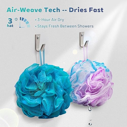 Four Stunning Colors, Endless Possibilities:This loofah pack comes in four eye-catching colors, allowing you to coordinate with your bathroom decor or pick your favorite shade. Equipped with a handy ribbon lanyard for easy hanging, a versatile addition to your bath accessories for women and men, it also makes a great gift for any occasion (Tips: Arrive vacuum-packed and flat but puff up after a few uses)
