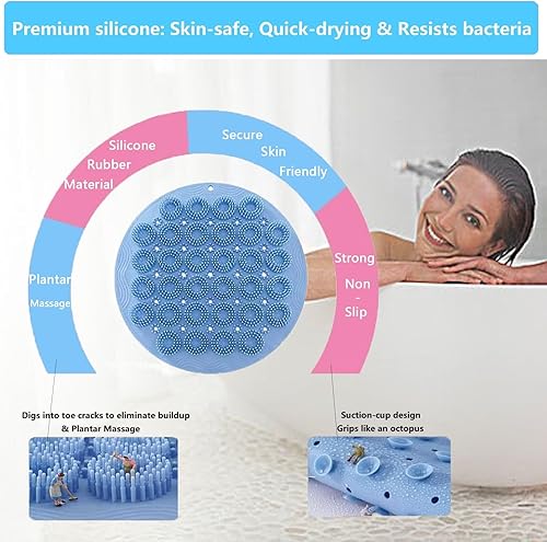 【Unique Design&Easy to clean】:The shower anti slip mat's long-bristles reach deep between toes to dislodge debris as the short-bristles massage nodes knead your soles,and The cleaning brush has a unique bottom suction cup design, which can firmly grip the ground when used. Easier to clean and dry than any fiber towels, shower brushes and shower sponges.