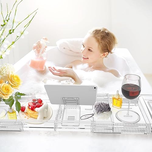 Stable and Practical: Made of thickened and crystal-clear acrylic material, transparent design, structurally stable, able to withstand the weight of various items. Non-slip silicone also keeps tub tray from sliding. Our bath tray for tub features multiple drainage holes, so you don't have to worry about accumulating water stains during use