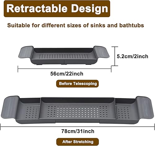 【Extendable and Foldable】The bathtub tray easily compatible with most bathtub models. Standard size: 21.6" x 6.9" x 2.4", the biggest long can extend to 30". Both two sides can be stretched and pull back.