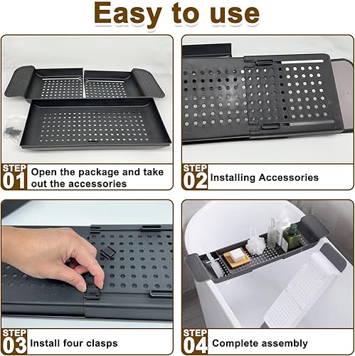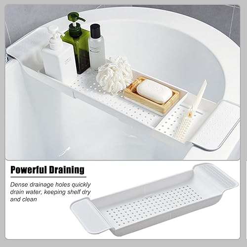 【Thoughtfully Design】Our bathtub tub organizer use multiple drain holes, handles on both sides with TPR soft rubber armrest stickers, bottom foot pads, and retractable design on both sides. You can use it with confidence.