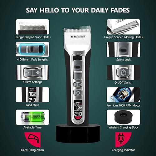 7000RMP HEAVY-DUTY MOTOR: The Hair Clippers Cordless that cutting through any type of hair trouble becomes an effortless task when using mens hair clippers cordless featuring a powerful motor, strong power and high speed, no pull and no snag hair. The the fade clippers has a LCD screen indicates 4 adjustable speeds (5500rpm, 6000rpm, 6500rpm, 7000rpm) with low vibration and noise, specialised trimmer for men would be ideal for getting those quick trims.