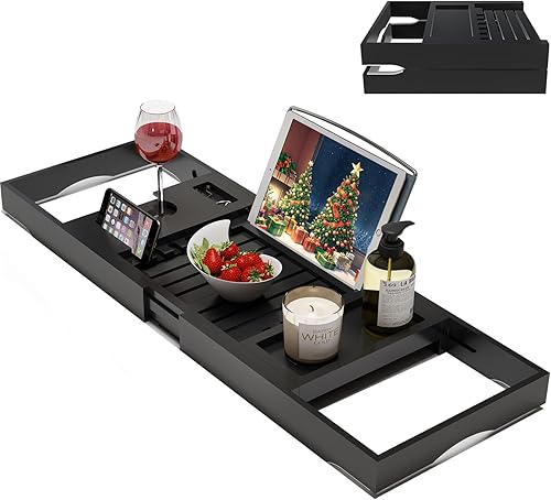 MULTI-FUNCTIONAL: This bamboo bath tray features 6 reading angles for ideal viewing experience of your book or Ipad, the wine glass holder,cup holder, phone slot and two side-trays are designed for your bath time. Enjoy bubble baths with your essentials within reach.
