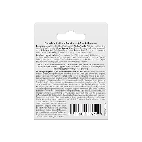 FORMULATED WITH AVOCADO OIL & HYALURONIC ACID: Contains replenishing omega-3 fatty acids and antioxidant Vitamins C and E, making it ideal for parched lips in need of natural nourishment. The barrier-protecting Hyaluronic Acid locks in moisture to protect and hydrate lips.