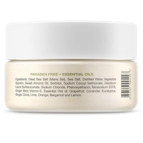 QUALITY INGREDIENTS FOR MAXIMUM BENEFITS. Our Dead Sea Salt Scrub is made with Sweet Almond Oil, Vitamin E and Essential Oils from Grapefruit, Coriander, Eucalyptus, Ginger, Clove, Lime, Orange, Bergamot and Lemon. It is paraben free, cruelty free and proudly Made in the USA.