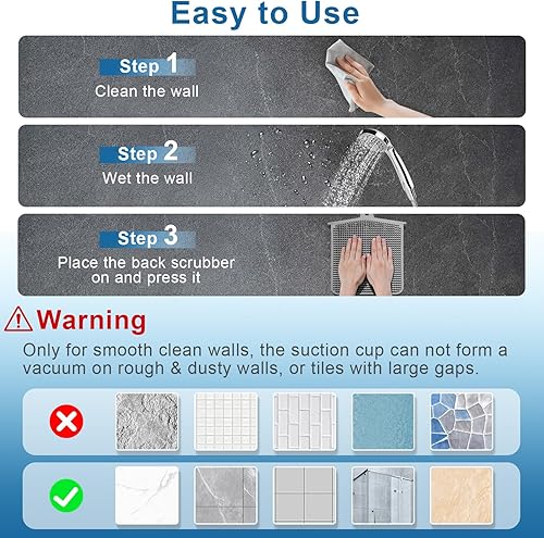 【Easy to use】Clean and wet the wall, place the shower back scrubber at the optimal height, press all the suction cups to push out the air inside, then simply rub the back against the back washer to massage and relieve itching while cleaning back.