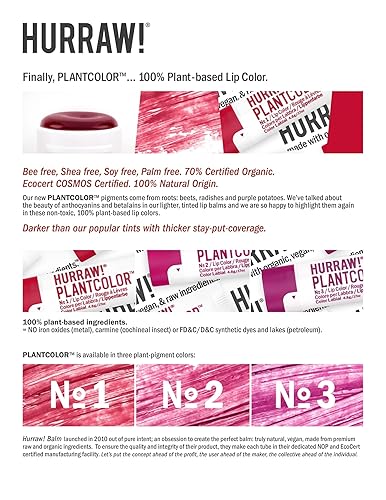 AVAILABLE in 3 shades: RED (№1), RED/PURPLE (№2) and PINK/PURPLE (№3) Lip Colors. Hurraw! PLANTCOLOR Lip Colors are darker and have thicker stay-put-coverage than our original Hurraw! Black Cherry, Raspberry and Hazelnut Sheer colored Tinted Lip Balms.
