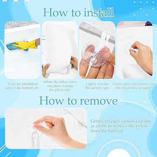 Two suction cups can firmly attach to the tub surface, preventing the pillow from slipping. Please use your finger drill at the edge of the suction cup to allow air to flow in, then the suction cup will be easily to remove. Do not pull again and again.