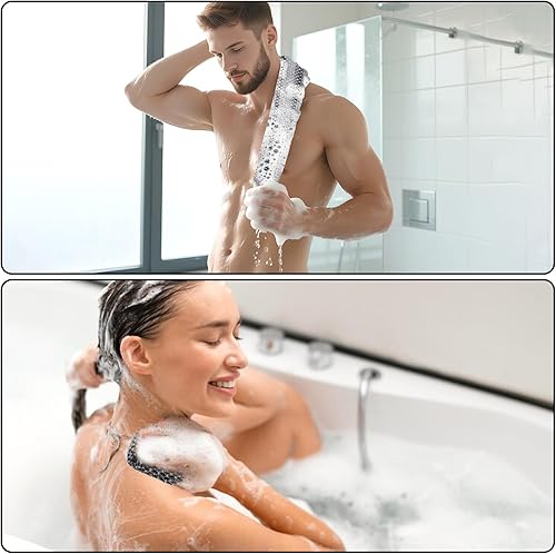 Extra Length for Back Scrubbing: Do you ever find it hard to scrub your back with the brush because you can’t reach it? Our back washer towel can do the job perfectly for you! When you fold it up, it is only the size of a handkerchief, but when stretched out, it is 40 inches long. You can stretch your arm freely, and you don't need to worry about its slim body. It can bear the pull of 100 kg