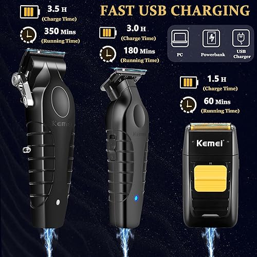 Large Capacity Battery & Long Life: Using USB quick connect charging port, it is convenient for you to charge at any time. KM-2296 Cordless Hair Clipper can be used for up to 350 minutes on a 3.5 hour charge; KM-2299 Hair Trimmer can be used for up to 180 minutes on a 3 hour charge; and KM-1102 Dual-Blade Razor can be used for up to 60 minutes on a 1.5 hour charge. USB charging ensures effortless recharging anywhere, making it perfect for home and travel