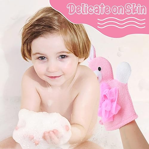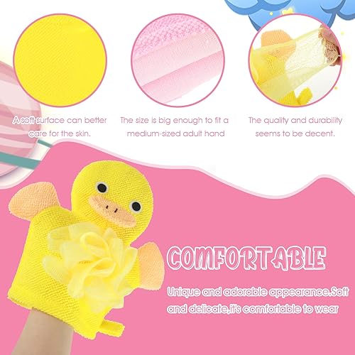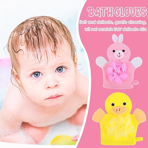 Cute Animal Design: Our bath mitt is the cutest thing you've ever seen! It features adorable cartoon animal designs like a yellow duck and pink rabbit to make bath time fun for kids. This bath sponge is a total game changer - it'll make your kids fall in love with bath time