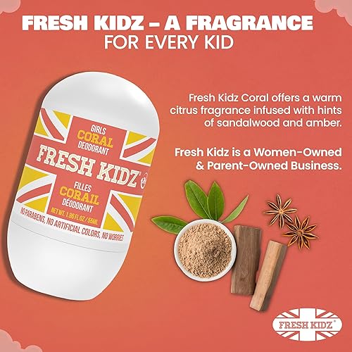 EFFECTIVE WITHOUT USE OF HARMFUL INGREDIENTS: Specifically formulated for pre-teen and teenage girls, Fresh Kidz deodorants provide 24-hour protection by effectively combating body odor and do this with the well-being of kids as a top priority. Our Girls Coral range has a warm citrus scent infused with hints of Sandalwood and Amber.