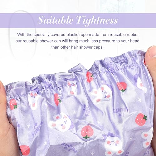【2Pcs Shower Caps】The package includes two kids shower caps, a pink kitty pattern, and a purple bunny pattern, more fashionable and cute. For personal use, you can choose it according to different moods, and for family use, family members can easily distinguish their shower caps according to color and pattern.