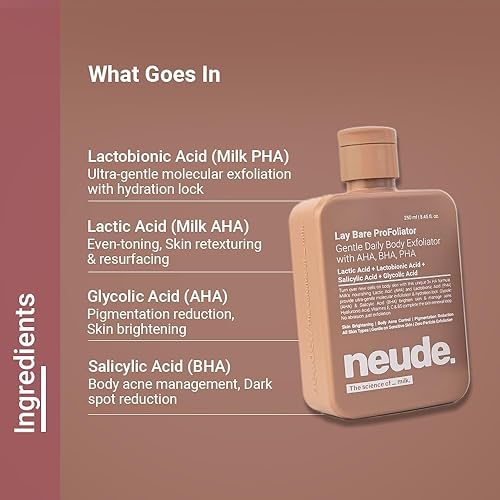 GENTLE ZERO PARTICLE EXFOLIATION: Neude Lay Bare is no ordinary body exfoliator scrub or exfoliating body wash. It is something much more. This body exfoliator has the most powerful and supercharged blend of molecular exfoliants that come alive with its 3x HA formulation, headlined by Lactobionic Acid. However, all of it comes together without any harsh or abrasive particles in a unique Zero Particle Exfoliation formulation that slides over most gently on your skin.
