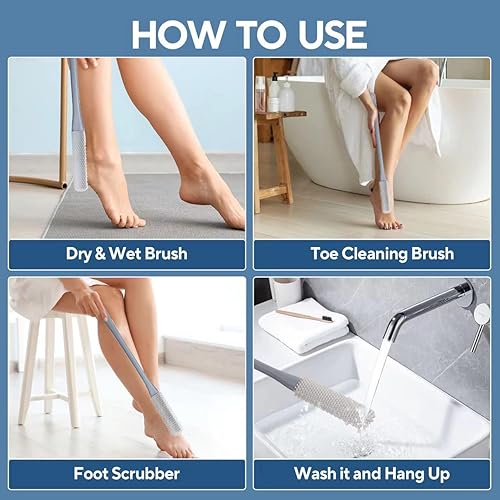 Long Handle Foot Scrubber: The foot brush features a soft silicone brush head and a sturdy plastic handle. It's anti-slip, waterproof, and moisture-resistant—perfect for cleaning feet and toes.