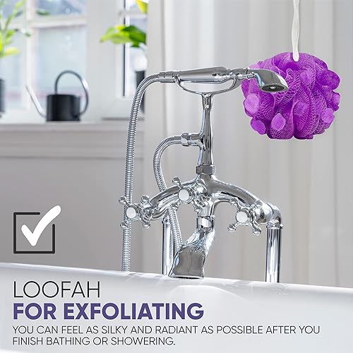 LOOFAH FOR EXFOLIATING: This mesh shower puff is the perfect tool for exfoliating your skin whilst washing. The soft, textured mesh works great when scrubbing away dirt, oil, and dead skin from your body, so you can feel as silky and radiant as possible after you finish bathing or showering.