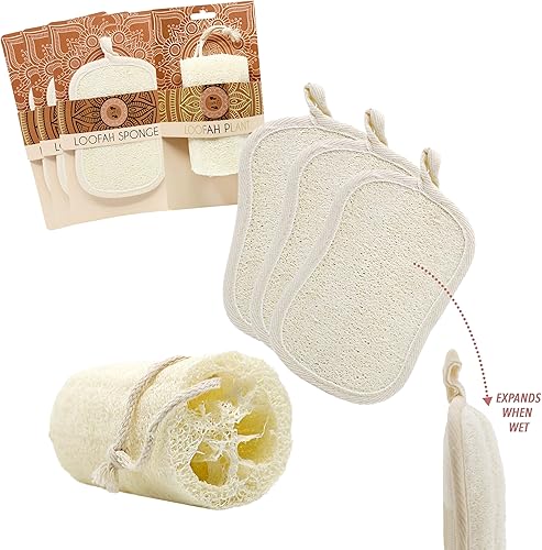 COMBO-PACK: Set of 4 Natural Loofah Sponges for all your exfoliating and cleansing needs for BODY AND FACE! - You get (1) Round Loofah Plant and (3) Dual-Sided Loofah Pads : Our natural loofah sponge set includes 4 exfoliating loofahs that are perfect for shower or bath use. Use the Round Loofah Plant for body scrubbing and exfoliating, and the Dual-sided loofah pads for face and body.