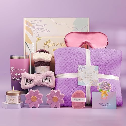 13 Pcs Self Care Gifts for Women,The Self Care Gifts Box for Women contains all carefully-designed thoughtful goodies:1x Silk Eye Mask;2x Flower Bath Bombs;1x Throw Blanket;1x 20oz Tumble with Slide Closed Lid,and Brush,Straw;1x Aluminum Cup Candle;1x Diamond Soap;1x Cozy Hair Band;1x Cozy Sleeping Socks;1x Gift Card Printed;1x Gift Box