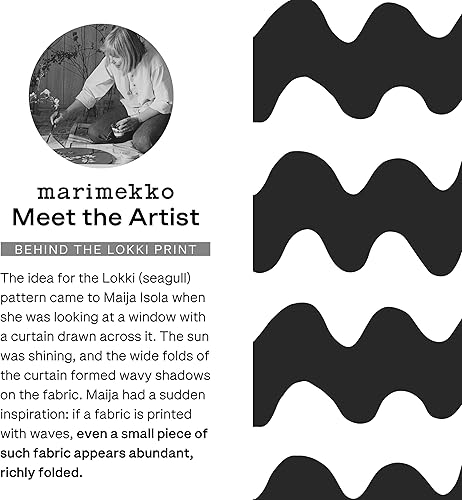 DESIGNER: The idea for the Lokki (seagull) pattern came to Maija Isola when she was looking at a window with a curtain drawn across it. The sun was shining, and the wide folds of the curtain formed wavy shadows on the fabric. Maija had a sudden inspiration: if a fabric is printed with waves, even a small piece of such fabric appears abundant, richly folded.