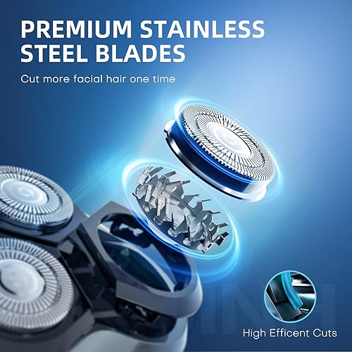 Fast & Close Cut - This LOBINH electric razor is equipped with 54pcs self-sharpening blades and 0.11mm thickness double-ring nets which has up to 135 holes, so that it can cut more facial hair one time for better shaving speed and effect. Make it idle without cutting hair while pressing the head to sharpen the blades can aviod pulling hair for a smoother shave.