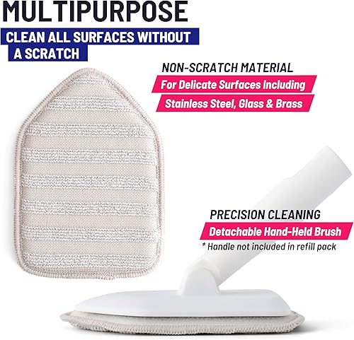 3-in-1 MULTIPURPOSE CLEANING -- The 2x Microfiber Pad Refills measure 6.5 inches in length x 4.5 inches in width and are made of non-scratch materials. Suitable surfaces include Porcelain, Ceramic, Marble, Mosaic, Fiberglass, Acrylic, Vinyl, Plastic, Wood, Zinc, Glass, Stainless Steel and Brass