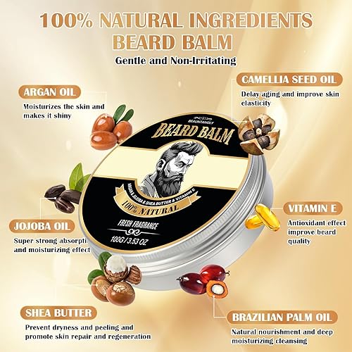 MOISTURIZING AND REPAIRING: Shea butter deeply moisturizes your beard and skin, soothing dryness and helping to reduce frizz and breakage. Argan oil and jojoba oil provide additional nutrients, repair damaged hair, and stimulate beard growth. Camellia seed oil and Brazilian palm oil work together to maintain your beard's softness and shine.