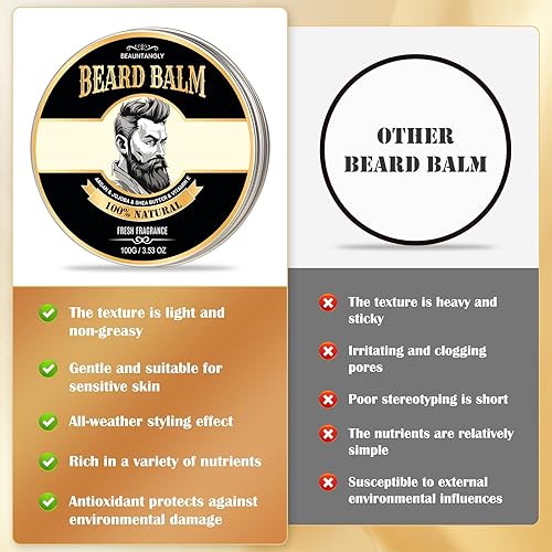 100% NATURAL INGREDIENTS: Our beard balm is crafted with 100% natural plant extracts, including shea butter, argan oil, jojoba oil, camellia seed oil, Brazilian palm oil, and vitamin E, providing deep nourishment and protection for your beard and skin. Free from any artificial additives, this balm ensures the purest care for your beard and skin.