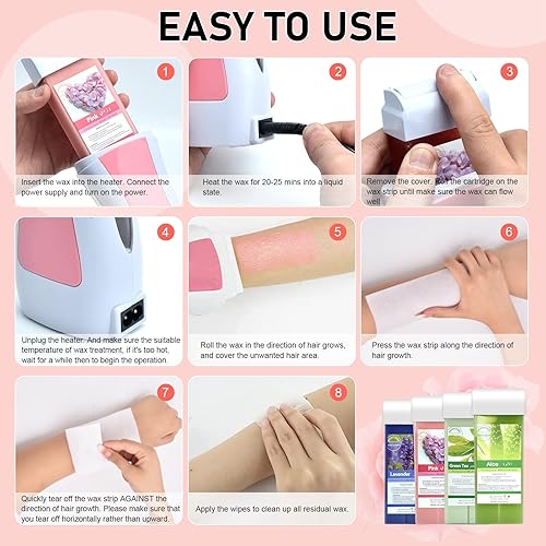 Easy & Safe to Use: Automatic heating, roller design, Rolls wax on skin without using brush or spatula; No filaments of residues left on the skin, best suitable for removing hair on large areas: legs, chest, arms, underarm, bikini, toes