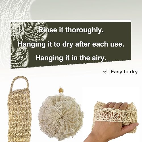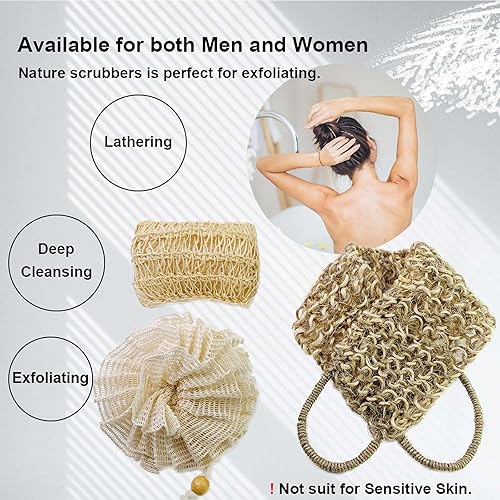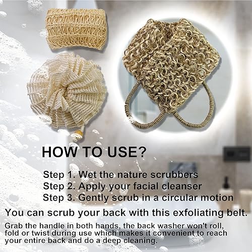 (NATURAL BATH KITS):You will receive 3 different shower scrubber,ramie loofah is soft and lathering well,sisal bath scrubber is rough for exfoliating,sisal back scrubber is rough for clean your entire back.