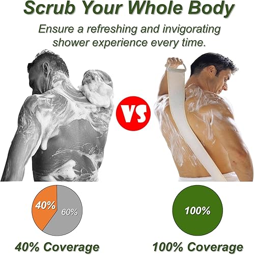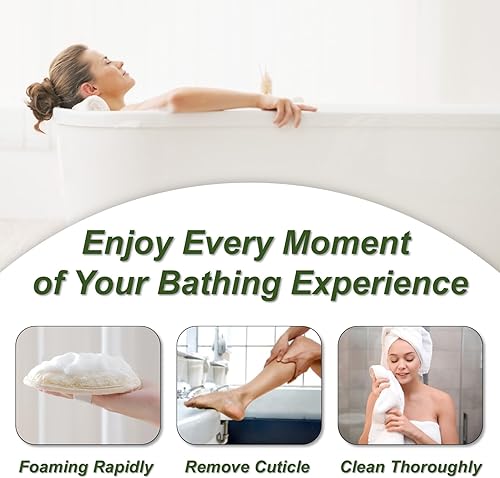 [Easy to Use and Store] When you receive the loofah sponge and find it flat and hard, please soak it in warm water for a few minutes to allow it to expand and soften, then apply shower gel or soap and scrub the body with the loofah sponge to remove keratin and dirt. It has a top lanyard for convenient storage, and it is also recommended to clean it after each use and hang it in a well-ventilated area to dry.