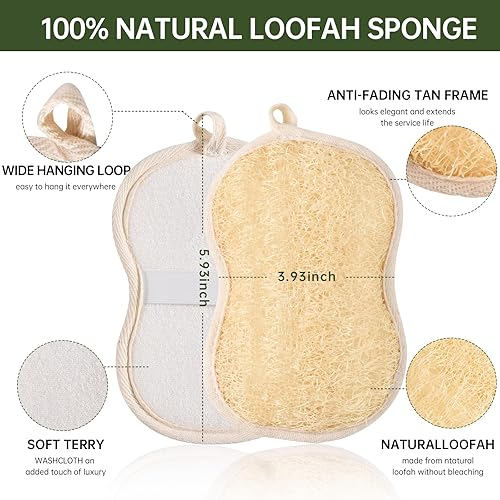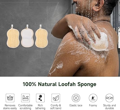 1)Natural Loofah Revitalize Your Skincare Routine Upgrade your shower experience with our plant-based loofah sponges! Crafted from 100% natural loofah fibers and reinforced with braided cotton ropes, this 3-piece set delivers gentle yet effective exfoliation. Perfect for daily body scrubbing, facial cleansing, or sensitive skin care, it removes dead cells while stimulating circulation for visibly smoother, glowing skin.