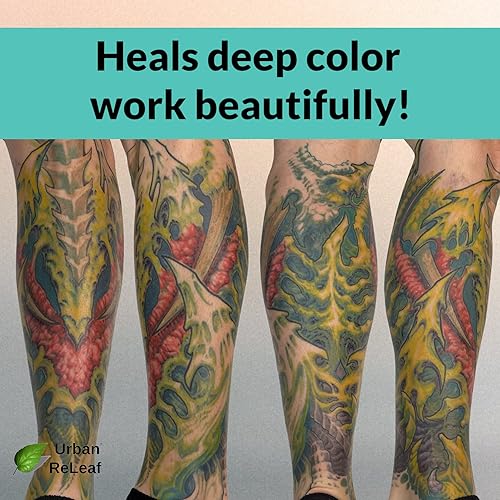 Urban ReLeaf Tattoo Solution Intended Use: Calm Irritated Skin, Soothe Crusty and Tight Tattoos, Reduce Ink Loss Warning: The safety of this product has not been determined. Net wt: 4 ounces Directions: Soak cotton ball with solution. Gently cleanse tattoo, soaking stubborn spots for up to 5 minutes. Do not rinse, allow to dry. Warnings: For external use only. Discontinue use if product causes irritation. Manufactured by: Urban ReLeaf LLC, St. Petersburg, FL 33710. Made in the USA. Product Ingredients: Dead Sea Salt, Mediterranean Sea Salt, Tea Tree Oil, Aloe Vera, Vitamin E