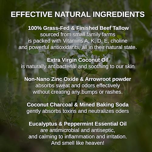 Made with only good-for-you organic ingredients including grass-fed tallow, virgin coconut oil, arrowroot powder, unrefined beeswax and gentle essential oils.