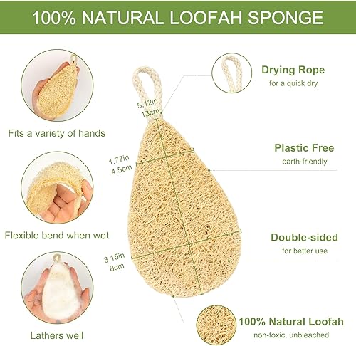 NATURAL LOOFAHS--Our organic loofah sponge is made from pure natural and biodegradable loofa, which is safe and environmentally friendly. From picking, shelling, drying and packing are free of any chemicals and harsh processes that could harm them. Loofah sponges Size: 5.12in*3.15in. Note: As a pure natural product, there may be slight variations in color from each product to another.