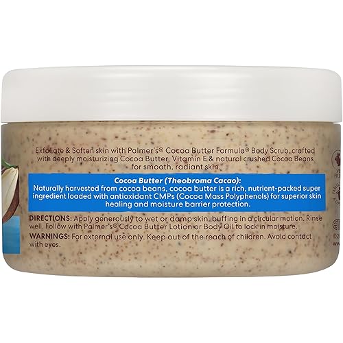 Body Scrub: Palmer's Cocoa Butter Formula Cocoa Body Scrub contains pure Cocoa Butter, Shea Butter, Vitamin E & natural crushed cocoa beans which help moisturize, refine, exfoliate & polish skin