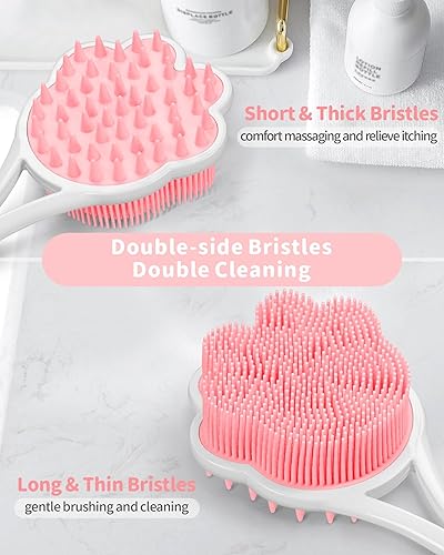 【15.7'' Double-Sided Back Brush】 One side of bath scrubber for body is dense and soft long bristles that generate more bubbles, deeply cleanse and remove dirt. On the other side of shower scrubber is thick short bristles that gently massage and exfoliate. Skin-friendly soft silicone bristles suits for all skin types, especially for boby and sensitive skin.