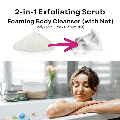 【2-in-1 Exfoliating Scrub + Foaming Body Cleanser (with Net)】Unlike ordinary salt scrubs, this product transforms into dense foam with a scrub net. A sea salt scrub and cleanser in one, it polishes as an exfoliant while cleansing skin, offering the refreshing experience of a natural body scrub for women.