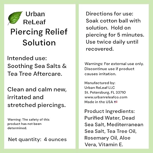 Urban ReLeaf Piercing Relief Solution Intended Use: Soothing Sea Salts & Tea Tree Aftercare. Clean and calm new, irritated and stretched piercings. Warning: The safety of this product has not been determined. Net wt: 4 ounces Directions: Soak cotton ball with solution. Hold on piercing 5 minutes. Use twice daily. Warnings: For external use only. Discontinue use if product causes irritation. Manufactured by: Urban ReLeaf LLC, St. Petersburg, FL 33710. Made in the USA. Product Ingredients: Purified Water, Dead Sea Salt, Mediterranean Sea Salt, Tea Tree Oil, Rosemary Oil, Aloe Vera Vitamin E.