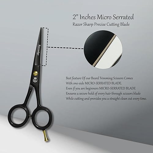 ✅EASY TO USE: We have featured our Beard Trimming Scissors with one-side MICRO-SERRATED BLADE. Even if you are beginners, MICRO-SERRATED BLADE ensures a secure hold of every hair through scissors blade while cutting and provides you a Straight clean Cut every time and can be used for multi-purposes like Hair Cutting, Hair Trimming, Beard Cutting and Mustache Grooming etc.